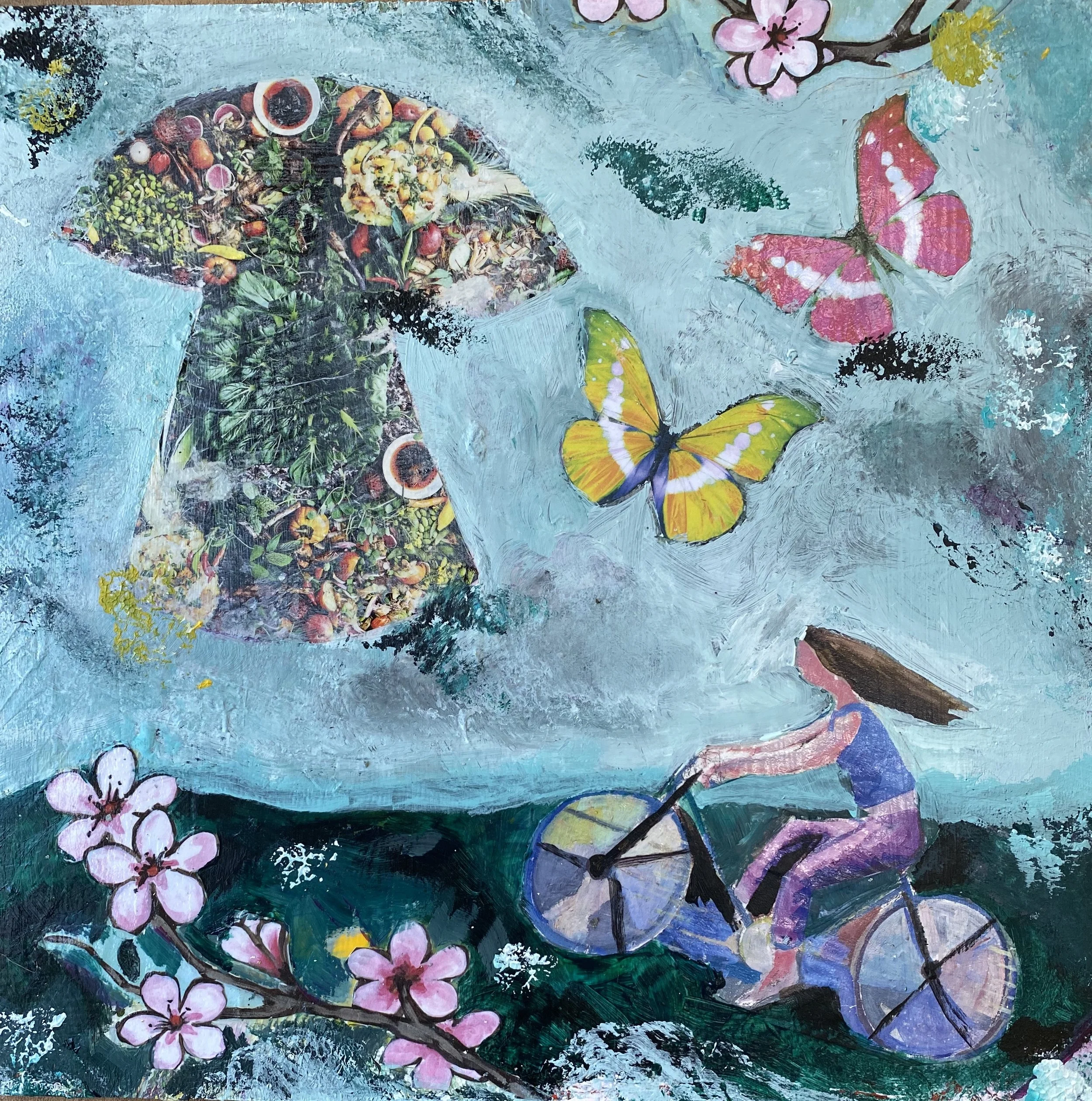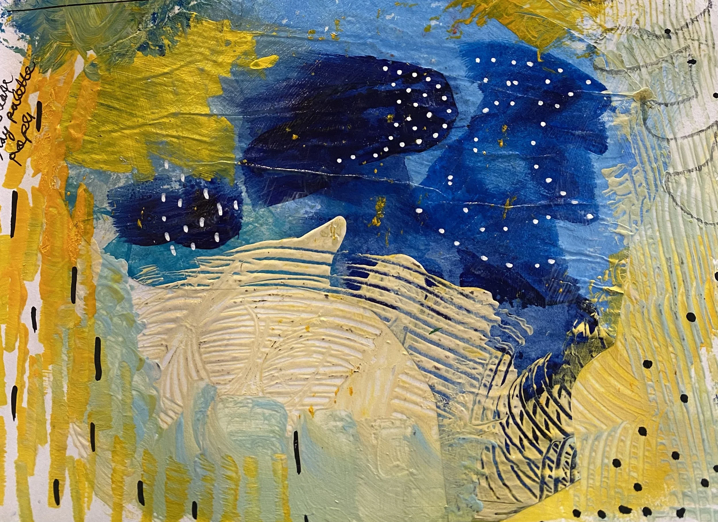 My painting process begins with loose play and experimentation. I put down many layers of paint along with intentional mark making and loose playful strokes. I add and discern what I want to change. I feel a sense of contentment when I know the painting is finished. The painting always has a message for me. I love the process.